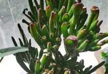 筒叶花月,是景天科青锁龙属的多年生草本植物。植株多分株,灌木状,茎较粗壮,圆柱形,表皮灰褐色;叶片肉质,互生,呈圆筒状,簇生于茎或分枝顶端,叶端呈斜截形,截面为椭圆形;花呈星状,淡白色;花期秋季。…全部>>