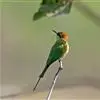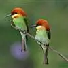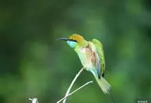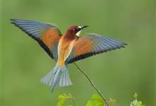 绿喉蜂虎是佛法僧目、蜂虎科的小型鸟类,共有9个亚种。身长22-25厘米,翼展29-30厘米,体重15-20克。喉绿色,额部、头顶至上背为锈红色,其余上体均为亮绿色。中央尾羽延长且端段狭细,…全部>>