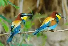 蓝喉蜂是蜂虎科蜂虎属鸟类。体长26-28厘米,嘴长而弯曲,有明显细长的中央尾羽。头部、颈部和背部为巧克力色,有黑色眼纹。喉部、腰部和尾羽为蓝色。腹部和两翼为绿色。幼鸟外观似成鸟,头部、颈部和背部为绿色,…全部>>