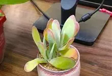 唐印为景天科伽蓝菜属的多年生肉质草本植物。植株中型,株高50厘米,宽20厘米,多分枝;叶片肉质,对生,卵形,全缘,先端钝圆,叶片淡绿色至灰绿色,表面被有厚厚的白粉,光照充足时,叶缘呈红色;圆锥花序,…全部>>