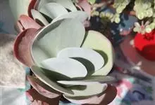 唐印为景天科伽蓝菜属的多年生肉质草本植物。植株中型,株高50厘米,宽20厘米,多分枝;叶片肉质,对生,卵形,全缘,先端钝圆,叶片淡绿色至灰绿色,表面被有厚厚的白粉,光照充足时,叶缘呈红色;圆锥花序,…全部>>