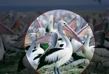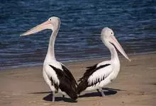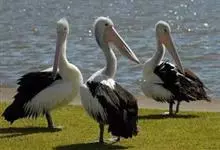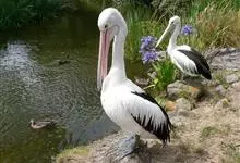 澳大利亚鹈鹕是一种大型涉禽,体重达13千克。生活于沿海及河川、湖泊等处。飞行力强而悠逸,常群飞群栖,极善于游泳,但不会潜水。游泳时张口捕鱼,将捕得的鱼兜入喉囊内。有时结群,排成长线,…全部>>
