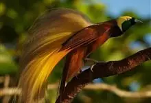 大极乐鸟是极乐鸟属中最大的鸟种。成年雄鸟体长可达到43厘米,雌性可达35厘米。雄鸟的额、颊、喉等墨绿色;头、颈黄色;上体暗赤栗色;腹部葡萄红色,胁部有长饰羽,其基部橙黄,中部黄色,…全部>>