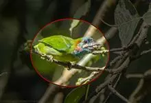 橙胸绿鸠体长24-29厘米,体重135-200克。是中等体型的绿鸠。黑色的翼上具醒目的黄色纵纹和翼缘。脸前部绿色,颈背及上背灰色。雄鸟下体黄绿,上胸淡紫,下胸橘黄;雌鸟胸部绿色。尾灰色,…全部>>