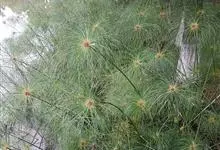纸莎草是莎草科、莎草属的植物,具有粗壮的根状茎,高达2-3米,茎秆簇生,粗壮,直立,钝三棱形。叶退化呈鞘状,茎秆顶端着生总苞片,呈伞状簇生,总苞片叶状,披针形,顶生花序伞梗极多,细长下垂。瘦果灰褐色,…全部>>