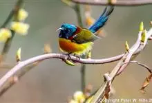 绿喉太阳鸟:共有9个亚种。小型鸟类,雄鸟体长13-15厘米、雌鸟10-12厘米。雄鸟前额至后颈、颏和喉辉绿色,头侧黑色,颈侧和背暗红色,两肩、下背橄榄绿色,腰鲜黄色,尾上覆羽和中央尾羽暗绿色,…全部>>