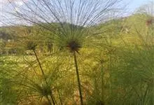 纸莎草是莎草科、莎草属的植物,具有粗壮的根状茎,高达2-3米,茎秆簇生,粗壮,直立,钝三棱形。叶退化呈鞘状,茎秆顶端着生总苞片,呈伞状簇生,总苞片叶状,披针形,顶生花序伞梗极多,细长下垂。瘦果灰褐色,…全部>>