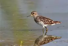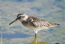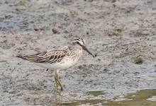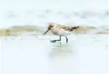 阔嘴鹬是涉禽,体长17厘米。特征为翼角常具明显的黑色块斑并具双眉纹。与黑腹滨鹬平滑下弯的嘴相比,阔嘴鹬的嘴具微小纽结,使其看似破裂。上体具灰褐色纵纹;下体白,胸具细纹;腰及尾的中心部位黑而两侧白。…全部>>