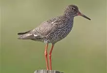 红脚鹬:体长28厘米,上体褐灰,下体白色,胸具褐色纵纹。飞行时腰部白色明显,次级飞羽具明显白色外缘。尾上具黑白色细斑。虹膜黑褐色,嘴长直而尖,基部橙红色,尖端黑褐色。脚较细长,亮橙红色,…全部>>