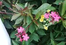变叶珊瑚花,是大戟科麻风树属常绿灌木。变叶珊瑚花单叶互生,倒阔披针形,叶面为浓绿色,叶背为紫绿色,叶柄具茸毛,叶面平滑,常丛生于枝条顶端;花单性,雌雄同株,花冠红色或粉红色,雌、雄花不同时开放;具乳汁,…全部>>