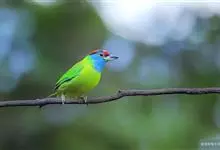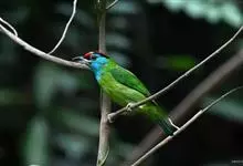 蓝喉拟啄木鸟,是须鴷科、拟啄木鸟属的鸟类。蓝喉拟啄木鸟为小型鸟类,体长20-23厘米。前额至头顶鲜红色,其上有一宽阔的黑色横带,将此红色分为前后二块;头侧、颏、喉蓝色,下喉两侧各具一红色点斑。…全部>>