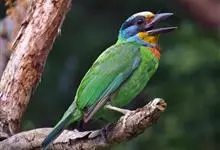 绿拟啄木鸟为鴷形目,须科,拟啄木属的一种。形较大拟啄木鸟略小,体长约260mm。头、颈及胸浅褐而具淡黄白色条纹;喉几为淡黄白色;身体余部草绿色。虹膜棕褐色,眼周裸露部黄色;嘴峰角黄色;跗跖和趾角黄…全部>>