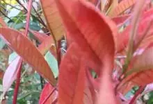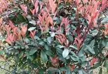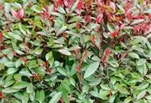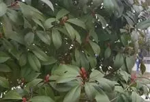 红叶石楠 是蔷薇科,石楠属杂交种,为常绿小乔木或灌木,乔木高可达5米、灌木高可达2米。叶片革质,长圆形至倒卵状、披针形,叶端渐尖,叶基楔形,叶缘有带腺的锯齿,花多而密,复伞房花序,花白色,梨果黄红色,…全部>>