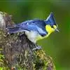 台湾黄山雀体长约13厘米。头顶至后颈黑色,有一长的黑色羽冠,羽冠末端和后颈中央白色。背苍绿色,两翅和尾黑色,羽缘蓝灰色,外侧尾羽白色。额基和下体鲜黄色,尾下覆羽白色,雄鸟腹部有一黑斑。…全部>>