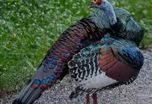 眼斑吐绶鸡:是火鸡科的两种鸟类之一。体型比普通火鸡略小些,体长1米左右,体重2.4-5.4千克,雄性比雌性略大,长得很特别,蓝色的秃脑袋上冒出几个橙黄色的疙瘩。但是它羽色艳丽,身体呈铜色及绿色。…全部>>