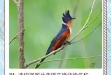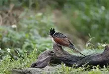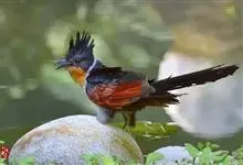 红翅凤头鹃:体长约38厘米,顶冠及凤头黑色,具显眼的直立凤头,背及尾黑色而带蓝色光泽,翅栗红色,喉及胸橙褐色,颈圈白色,腹部近白。虹膜淡红褐色。嘴黑色,下嘴基部近淡土黄色,嘴角肉红色,脚铅褐色。…全部>>