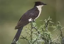 斑翅凤头鹃: 成鸟具羽冠,上体及头侧、翅、尾等黑色,具铁绿色亮辉,尾羽端部具白斑,两侧者形宽,中央者较狭;下体白色、淡灰白或略带棕黄色。虹膜褐至红褐色;嘴黑色;脚灰蓝黑色。…全部>>