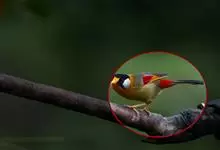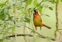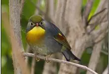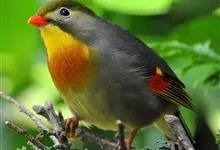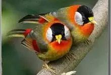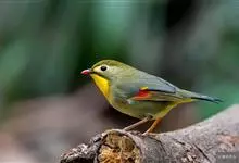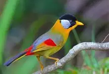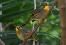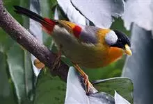 银耳相思鸟小型鸟类,体长14~18厘米。头顶黑色,耳羽银灰色,前额橙黄色;外侧飞羽橙黄色,基部朱红色,极为鲜艳、醒目。尾圆形,尾上、尾下覆羽朱红色,尾暗灰褐色,外侧尾羽橙黄色,其余上体橄榄绿或橄榄黄色。…全部>>