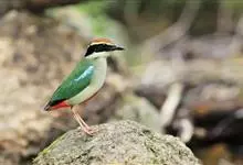 绿胸八色鸫:是雀形目八色鸫科的鸟类,共有12个亚种。体长为16-18厘米,体重65-69克。体型圆胖,尾短,腿长。头黑,上体绿色,两翼深色而具白色斑纹,头顶至后枕深褐,胸及腹部苹果绿,臀亮红。…全部>>