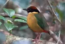 绿胸八色鸫:是雀形目八色鸫科的鸟类,共有12个亚种。体长为16-18厘米,体重65-69克。体型圆胖,尾短,腿长。头黑,上体绿色,两翼深色而具白色斑纹,头顶至后枕深褐,胸及腹部苹果绿,臀亮红。…全部>>