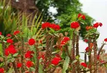 虎刺梅:别称铁海棠,是蔓生灌木植物。茎多分枝,长60-100厘米,直径5-10毫米,具纵棱,密生硬而尖的锥状刺,刺长1-1.5厘米,直径0.5-1.0 毫米,常呈3-5列排列于棱脊上,呈旋转。叶互生…全部>>