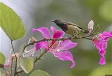 纹背捕蛛鸟:为太阳鸟科捕蛛鸟属的鸟类。是太阳鸟科中体型较大的一种,体重25-45克,体长160-210毫米。嘴粗长而尖且向下弯曲。上体橄榄黄色具黑色中央斑纹。下体淡黄白色满布黑色纵纹,尾具黑色次端斑。…全部>>