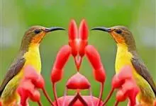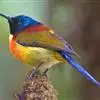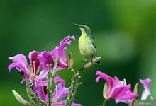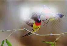 绿喉太阳鸟:共有9个亚种。小型鸟类,雄鸟体长13-15厘米、雌鸟10-12厘米。雄鸟前额至后颈、颏和喉辉绿色,头侧黑色,颈侧和背暗红色,两肩、下背橄榄绿色,腰鲜黄色,尾上覆羽和中央尾羽暗绿色,…全部>>