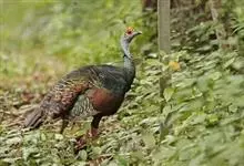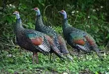 眼斑吐绶鸡:是火鸡科的两种鸟类之一。体型比普通火鸡略小些,体长1米左右,体重2.4-5.4千克,雄性比雌性略大,长得很特别,蓝色的秃脑袋上冒出几个橙黄色的疙瘩。但是它羽色艳丽,身体呈铜色及绿色。…全部>>