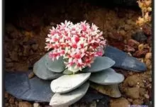叶子表面宽厚,富肉质感且带有磨纱质感,看像石头质地;开红色小花,生于植株顶部,倒伞形密生,形状像花球一样。