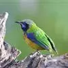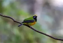 金额叶鹎是和平鸟科、叶鹎属的鸟类。体长16-20厘米。额和头顶前部金桔色,整个上体包括两翅表面草绿色。颏、喉黑色,其外围有一圈黄色,其余下体浅绿色,翼缘蓝紫色,翅上小覆羽翠蓝色。野外特征极明显,…全部>>