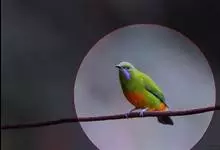 橙腹叶鹎体形大小和金额叶鹎相似,体长16~20厘米。额至后颈黄绿色,其余上体绿色,小覆羽亮钴蓝色,形成明显的肩斑。颏、喉、上胸黑色具钴蓝色髭纹,其余下体橙色。飞羽和尾羽雄鸟黑色、雌鸟绿色。…全部>>