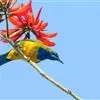 金额叶鹎是和平鸟科、叶鹎属的鸟类。体长16-20厘米。额和头顶前部金桔色,整个上体包括两翅表面草绿色。颏、喉黑色,其外围有一圈黄色,其余下体浅绿色,翼缘蓝紫色,翅上小覆羽翠蓝色。野外特征极明显,…全部>>