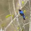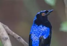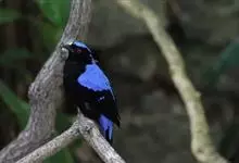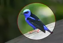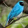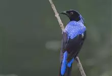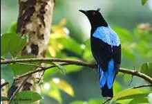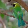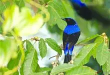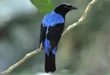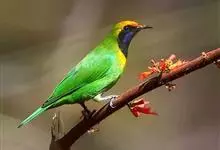 蓝翅叶鹎:小型鸟类,体长15-18厘米。雄鸟通体草绿色,尾蓝绿色,肩和翅亮蓝 色,胸缀有黄色,颏、喉黑色。雌鸟颏,喉蓝绿色。栖息在海拔1500米以下的常绿阔叶林、次生林和林缘疏林灌丛中。…全部>>