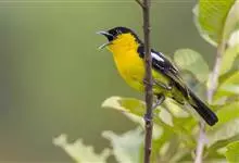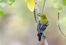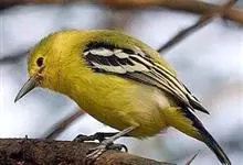 黑翅雀鹎:体重14-19克,体长11.5-16厘米。是树栖性绿色小鸟,外形与叶鹎相似,下体黄色。鸟喙直,翼长而尖,总体羽毛是绿色和黄色相结合,翼上具两道明显近白色横纹,翼近黑而羽缘白。…全部>>