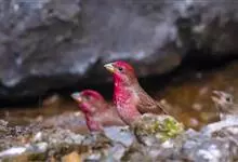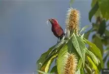 酒红朱雀小型鸟类,体长13~15厘米。雄鸟通体深红色,头部深朱红或棕红色,下背和腰玫瑰红色,眉纹粉红色而具丝绢光泽。两翅和尾黑褐或灰褐色、具暗红色狭缘,内侧两枚三级飞羽具淡粉红色先端。…全部>>