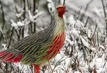 血雉雉科血雉属鸟类,别名血鸡、松花鸡,血雉的雄鸟大覆羽、尾下覆羽、尾上覆羽、脚、头侧、腊膜为红色,故称血雉。其别名甚多,各地皆异。在甘肃,因其胸侧和翅上覆羽沾绿,被称为“绿鸡”;因其羽毛形似柳叶,…全部>>