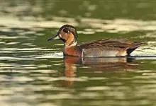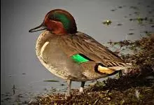 绿翅鸭是小型鸭类,体长37厘米,体重约0.5千克。嘴脚均为黑色。雄鸟头至颈部深栗色,头顶两侧从眼开始有一条宽阔的绿色带斑一直延伸至颈侧,尾下覆羽黑色,两侧各有一黄色三角形斑,在水中游泳时,极为醒目。…全部>>