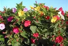 即紫茉莉,英文名:Four-o'clock,Marvel of Peru,为紫茉莉科、紫茉莉属多年生草本植物,一年生栽培。株高50~80cm。根粗壮,茎多分枝而散生。叶对生,卵形或心脏形。花数朵簇生…全部>>
