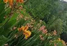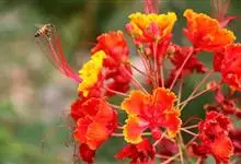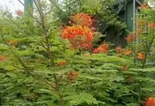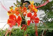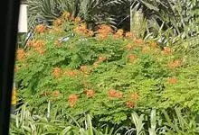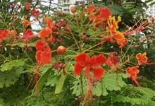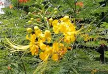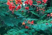 洋金凤 Sw.),豆科小凤花属灌木状或小乔木植物,枝无毛,绿或粉绿色;二回羽状复叶;总状花序伞房状,萼片无毛,花瓣橙红或黄色,圆形,花丝红色,子房无毛,花柱橙黄色;荚果窄而薄,…全部>>