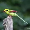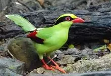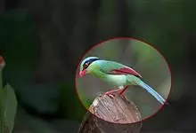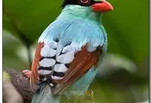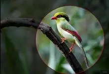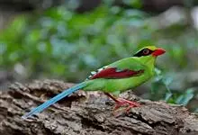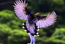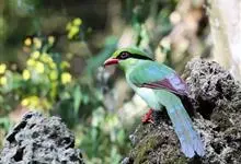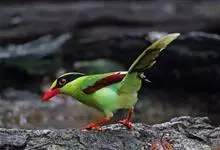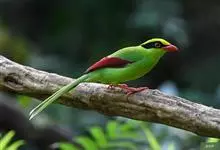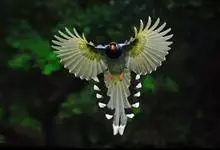 蓝绿鹊:中型鸟类,共有5个亚种。体长36-38厘米。尾长,嘴、脚红色。通体羽色主要为草绿色,宽阔的黑色贯眼纹向后延伸到后颈,在绿色的头侧极为醒目。两翅栗红色,内侧飞羽具黑色次端斑和白色尖端。尾绿色,…全部>>