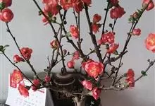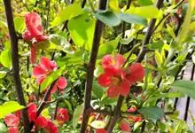 贴梗海棠Nakai)是蔷薇科、木瓜海棠属植物。落叶灌木,高达2米,枝条直立开展,有刺。叶片卵形至椭圆形,稀长椭圆形,长3-9厘米,宽1.5-5厘米。花先叶开放,3-5朵簇生于二年生老枝上。…全部>>