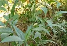 酸模叶蓼 Delarbre),是蓼科蓼属的一年生草本。株高可达90厘米;茎直立,分枝,节部膨大;叶披针形或宽披针形,先端渐尖或尖,基部楔形,上面常具黑褐色新月形斑点,…全部>>