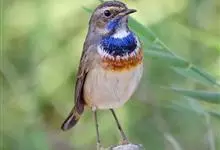 蓝点颏亦称“蓝喉歌鸲”,通称蓝靛颏儿。身体大小和麻雀相似,体长12-13厘米,体重17-18克。头部、上体主要为土褐色。眉纹白色。尾羽黑褐色,基部栗红色。颏部、喉部辉蓝色,下面有黑色横纹。下体白色。…全部>>