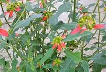 猩猩草:常绿或半常绿灌木,盆栽时株高0.5米-2米,在亚热带地区可长到6米以上。茎直立而光滑,单叶互生,卵状椭圆形至阔披针形,具不规则的深缺刻。长10-15厘米。花小,有蜜腺,排列成密集的伞房花序。…全部>>