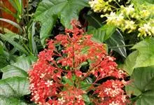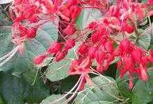 赪桐 Sweet)是唇形科、大青属灌木,高1-4米,叶片圆心形,顶端尖或渐尖,基部心形,边缘有疏短尖齿,表面疏生伏毛,二歧聚伞花序组成顶生,大而开展的圆锥花序,花序的最后侧枝呈总状花序,花萼红色,…全部>>