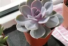 紫珍珠是景天科石莲花属的多年生肉质草本植物。植株中小型;叶片肉质,匙形,呈莲座状紧密排列;叶片粉紫色,叶缘呈粉白色,光照充足时颜色亮丽,不足时叶色会呈现深绿色或灰绿色,叶面光滑,被轻微白粉,…全部>>
