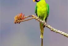紫红头鹦鹉是鹦形目鹦鹉科的鸟类。鸟体为绿色,头部中间为红色,下颏下方延伸到脸颊下方,环绕整个颈部有一条黑色的环状羽毛,并连接一条蓝绿色的条状羽毛。…全部>>