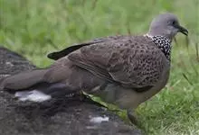珠颈斑鸠,别名花斑鸠、珍珠鸠、花脖斑鸠、鸪鹪,是鸠鸽科副斑鸠属鸟类。体型中等,体长27~34cm,体重120~205g,雌鸟和雄鸟羽色相似,但雌鸟不如雄鸟羽色亮泽。珠颈斑鸠前额至头顶羽色稍淡,…全部>>