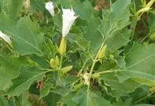 曼陀罗,茄科曼陀罗属一年生大型草本植物,全株光滑。有臭气;叶呈广卯形,边缘具不规则波状浅齿裂;花单生于枝杖间或叶腋,直立,有短梗;花萼是筒状裂片三角形,颜色为白色或淡紫色;果实为蒴果卵状,…全部>>