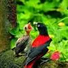 朱鹂:中等鸟类,体长23-28厘米。雄鸟绛紫红色,头、上胸及翼黑色。雌鸟上背及背部深灰色,尾覆羽及尾绛紫红色,腹部及下胸白而密布黑色纵纹。与鹊色鹂幼鸟的区别在上背灰色较深,下体白色较少且纵纹较粗。…全部>>